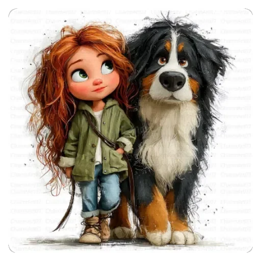 Uma menina com cabelos ruivos e um cachorro grande ao lado. Ela está usando uma jaqueta verde, calças jeans e botas castanhas, segurando a guia do cachorro.