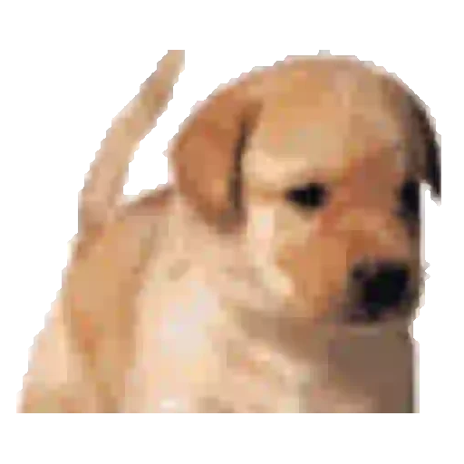 Um filhote de cachorro amarelo com orelhas caídas e cauda levantada, olhando para a frente com expressão fofa.
