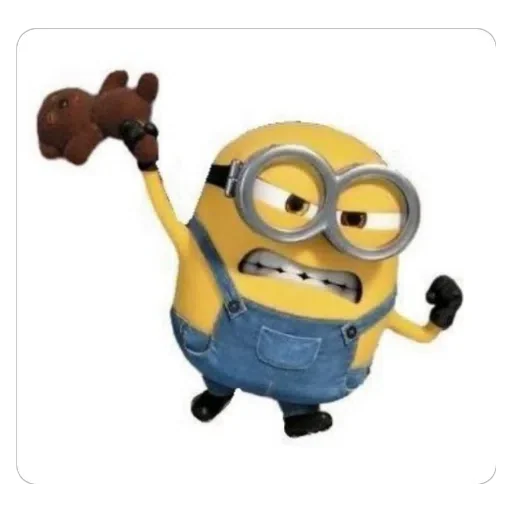 Um Minion amarelo com óculos e macacão azul, com uma expressão facial zangada e um objeto marrom na mão levantada.