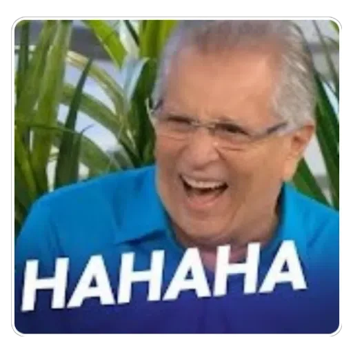 Um homem mais velho com cabelo grisalho e óculos, vestindo uma camisa azul, ri com a boca aberta. O texto 'HAHAHA' aparece em branco na parte inferior.