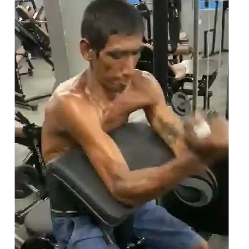 Homem suado fazendo exercício na academia, sem camisa e com tatuagem no braço.