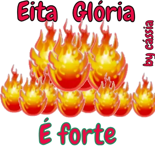 Um conjunto de chamas em tons de laranja e vermelho com as frases 'Eita Glória' e 'É forte' em letras coloridas.
