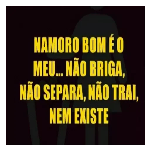 Um fundo preto com uma silhueta escura de uma pessoa e texto em amarelo que diz: 'Namoro bom é o meu... Não briga, não separa, não trai, nem existe'.