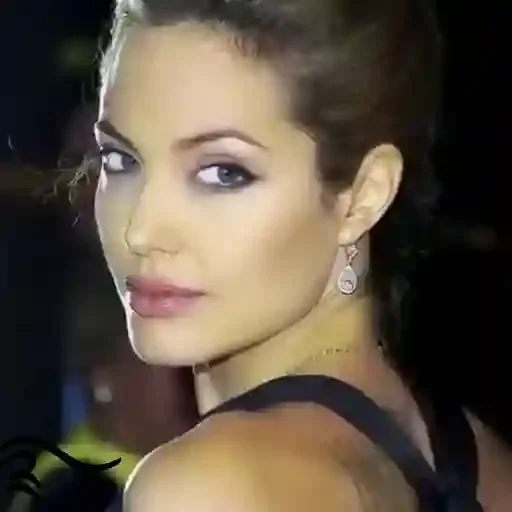 Rosto de uma mulher loira com cabelo preso e maquiagem, olhando por cima do ombro. Ela está usando um vestido preto e brincos.