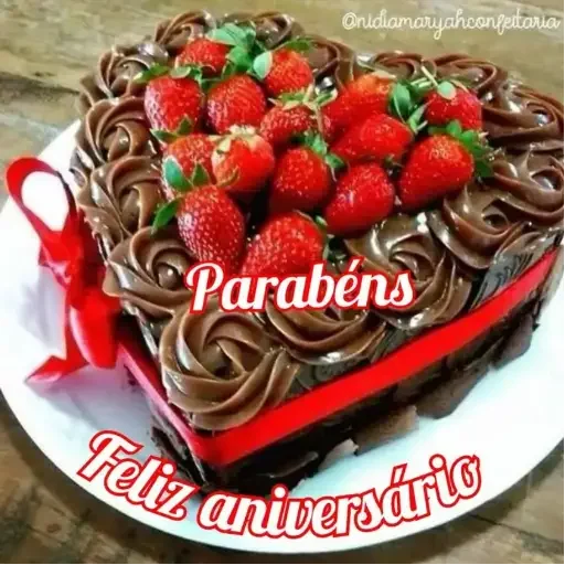Um bolo de chocolate com morangos em cima, decorado com chocolate e uma faixa vermelha, com o texto 'Parabéns' e 'Feliz aniversário'.