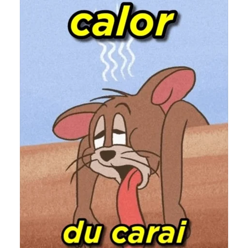 Tom, o gato, com expressão de calor extremo, língua para fora e gotas de suor. O texto 'calor du carai' está escrito em amarelo.