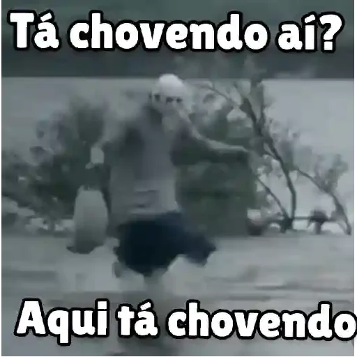 Um homem correndo em uma rua molhada, com texto 'Tá chovendo aí? Aqui tá chovendo'.
