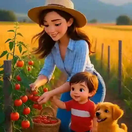 Uma mulher e uma criança colhendo tomates em um campo, com um cachorro ao lado. A mulher usa um chapéu e uma camisa azul, enquanto a criança veste uma camiseta vermelha.