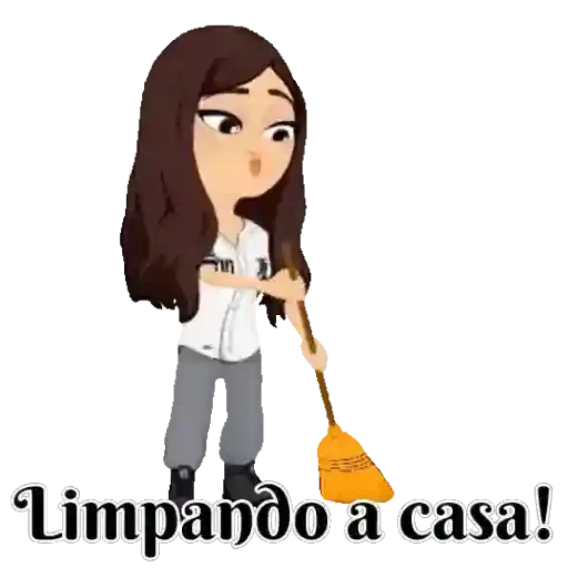 Uma mulher de cabelo castanho com expressão de desinteresse segurando uma vassoura, com o texto 'Limpando a casa!'