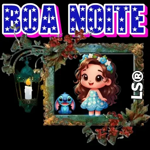 Uma menina de cabelo castanho e vestido azul dentro de uma moldura decorada, com Stitch ao lado e uma lanterna. A imagem traz 'BOA NOITE' em letras grandes.