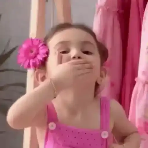 Menina com flor rosa no cabelo e vestido rosa, cobrindo a boca com a mão.