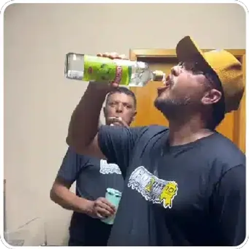 Dois homens, um bebendo de uma garrafa de cerveja e o outro segurando uma lata de cerveja, ambos vestindo camisetas pretas.