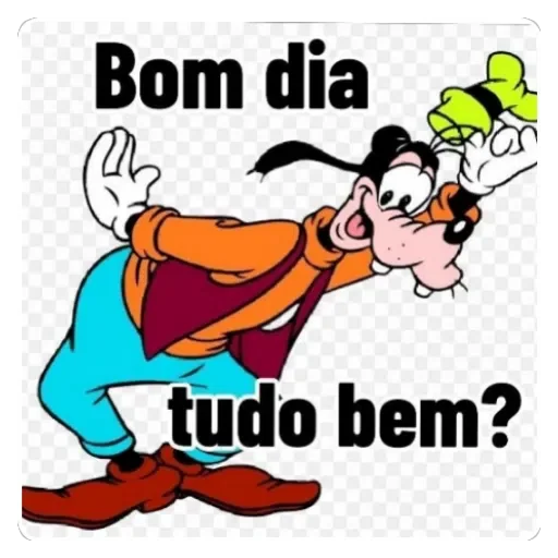 Goofy com expressão surpresa e animada, usando um chapéu verde, com as frases 'Bom dia tudo bem?' em preto.