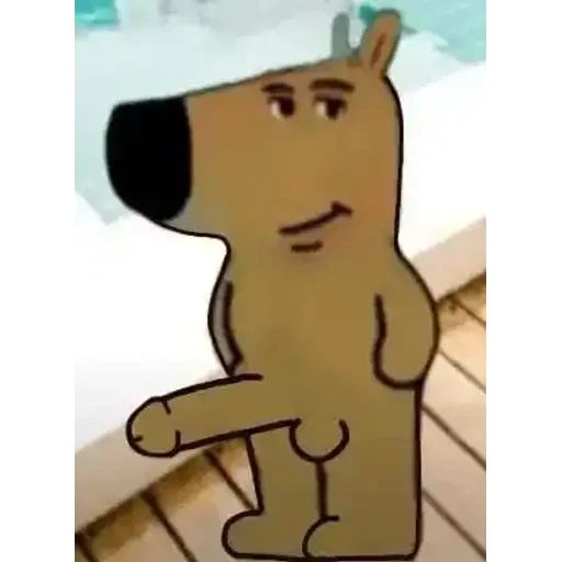 Um cão cartoon castanho com focinho preto e expressão curiosa, em pé sobre uma superfície de madeira.