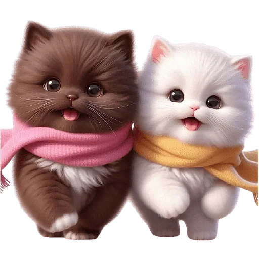 Dois gatinhos fofos, um castanho com cachecol rosa e outro branco com roupa laranja, ambos com expressão doce.