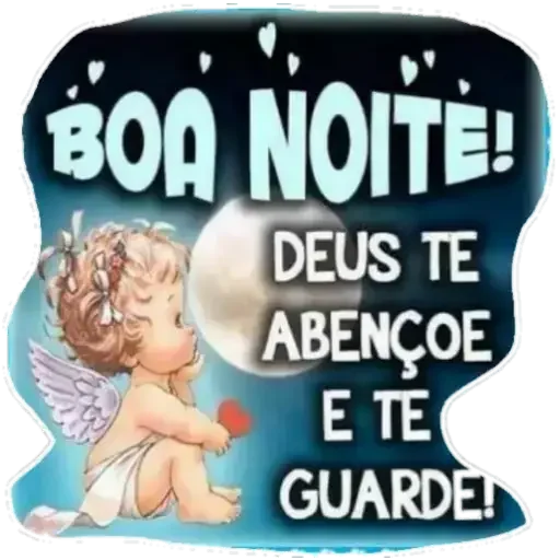 Um anjo bebê com asas e auréola segura um coração vermelho, com a lua cheia ao fundo. A imagem traz o texto 'BOA NOITE! DEUS TE ABENÇOE E TE GUARDE!'