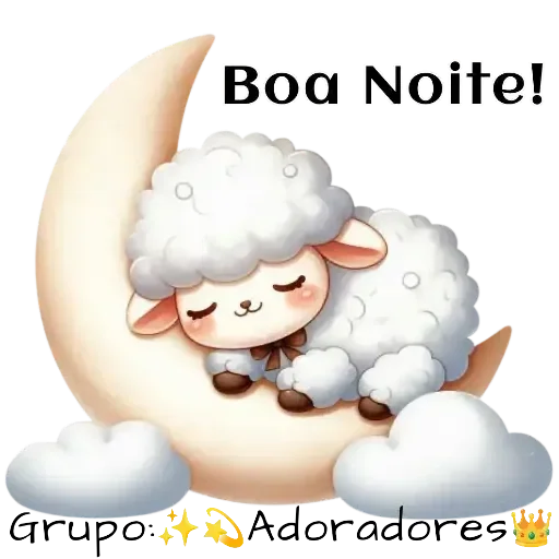 Um cordeirinho branco dormindo em uma lua crescente com nuvens fofas ao redor, com a frase 'Boa Noite!' escrita acima e 'Grupo: Adoradores' abaixo.