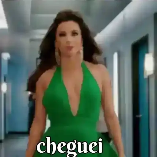 Uma mulher de cabelo castanho escuro e vestido verde, com o texto 'cheguei' sobreposto na parte inferior.