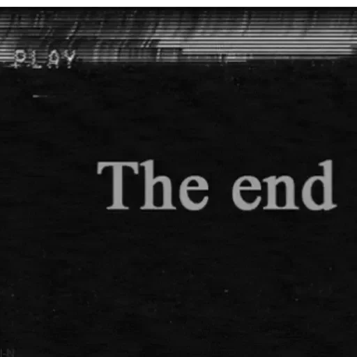 Uma tela preta com o texto 'The end' em cinza, estilo final de filme. Parte superior com efeito de distorção e 'PLAY' em branco.