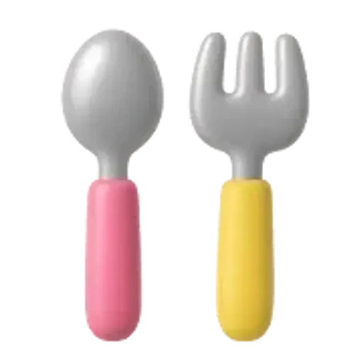 Uma colher e um garfo de plástico para bebê, com cabos rosa e amarelo.