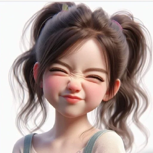 Menina com cabelos castanhos em dois coque altos, corando e fazendo careta fofa com um sorriso leve.