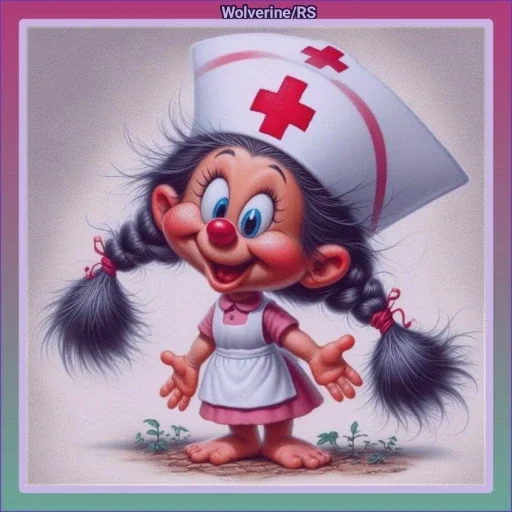 Uma enfermeira cartoon com cabelos pretos em duas tranças e um chapéu de enfermeira com cruz vermelha. Ela tem uma expressão alegre e está com as mãos estendidas.