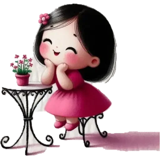 Menina de cabelo preto e vestido rosa sentada à mesa com um vaso de flores cor-de-rosa, com as mãos no rosto e olhos fechados.