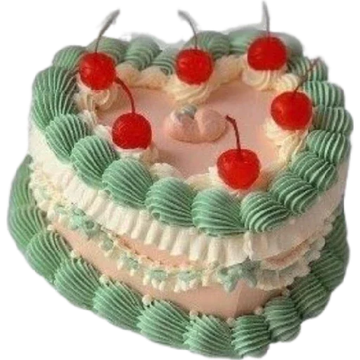 Bolo rosa decorado com confeitos verdes e cerejas vermelhas.