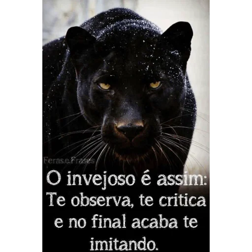 Um tigre preto com olhos amarelos e neve na pelagem observa diretamente a câmera, com a frase 'O invejoso é assim: Te observa, te critica e no final acaba te imitando.' sobreposta.