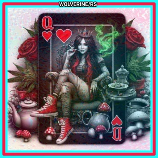 Uma mulher com longos cabelos escuros e maquiagem pesada senta-se em uma cadeira, cercada por rosas vermelhas, cogumelos e um cartão de jogar com a rainha de copas. Ela veste botas vermelhas e um look ousado.