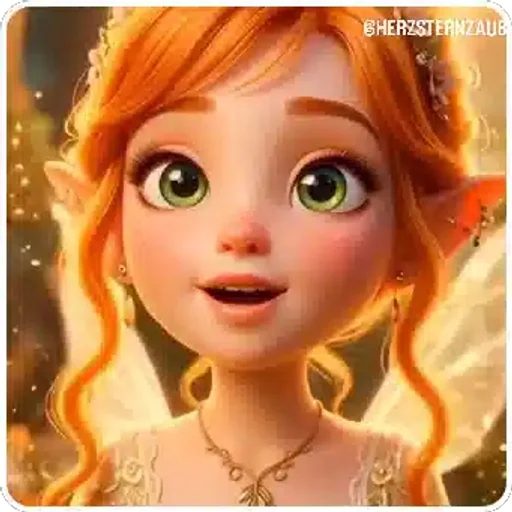 Uma fada cartoon com cabelos laranjas ondulados e olhos verdes brilhantes, usando uma coroa e um colar. Ela tem asas de fada atrás dela.