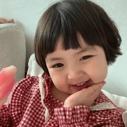 Menina com franja e camisa xadrez vermelha e branca, com a mão no queixo e um brinquedo rosa na outra mão.