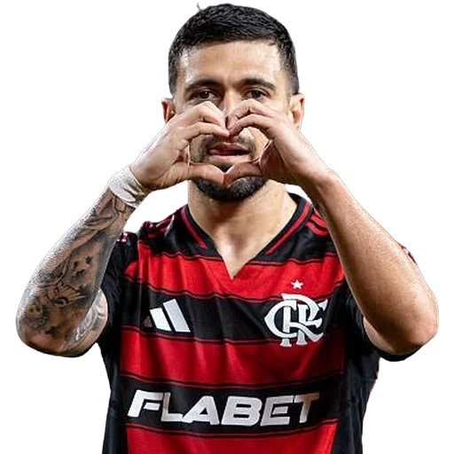 Jogador de futebol com camisa vermelha e preta fazendo um gesto com as mãos na boca. A camisa tem o logo da Adidas e um símbolo branco no peito.