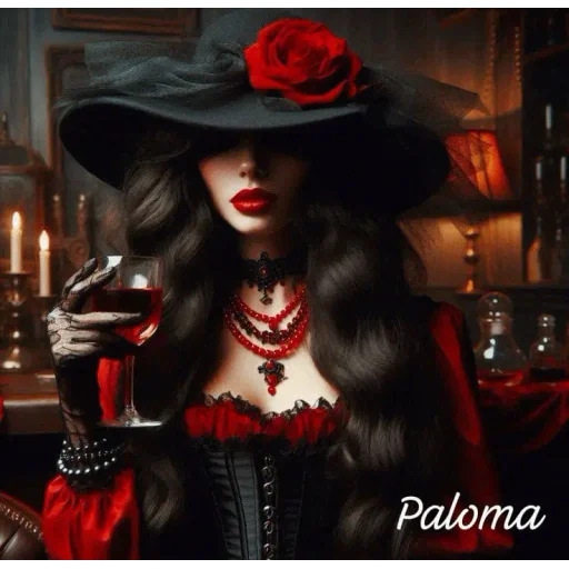 Mulher com chapéu preto e rosa vermelha, segurando um copo de vinho em um ambiente escuro com velas acesas. Ela usa um colar vermelho e tem o nome 'Paloma' escrito no canto inferior direito.