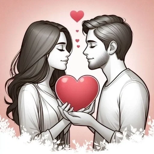 Um casal de anime se olhando com carinho, segurando um coração vermelho e com pequenos corações saindo de suas cabeças.