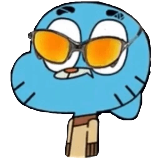 Personagem de desenho animado azul com óculos de sol laranja e expressão divertida.