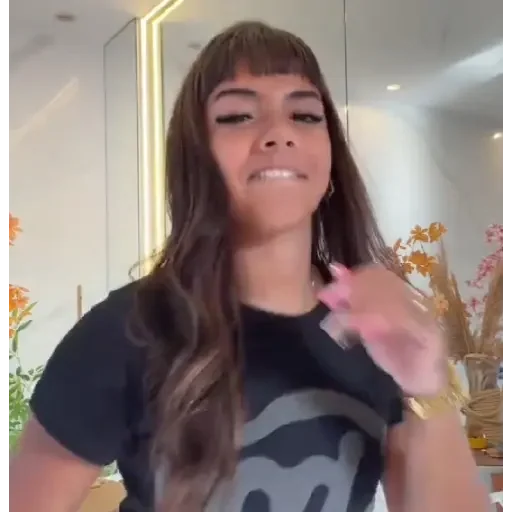 Uma jovem mulher com cabelo castanho e franja fazendo um gesto com a mão direita, usando um blazer preto com uma…