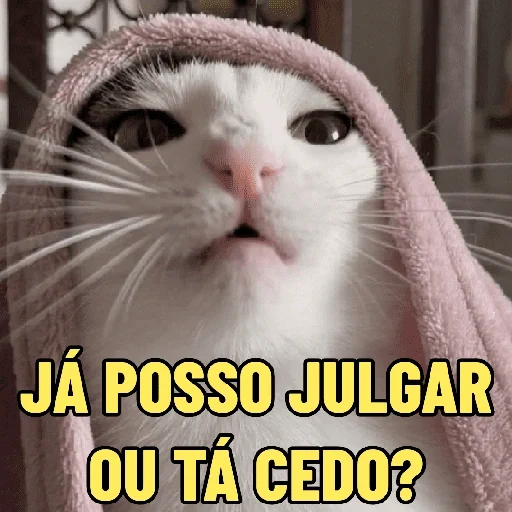 Gato branco com expressão séria, coberto por uma toalha rosa. O texto 'JÁ POSSO JULGAR OU TÁ CEDO?' aparece em letras amarelas.