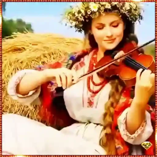 Mulher loira com coroa de flores, tocando violino em um campo de trigo. Ela veste uma blusa branca com detalhes em vermelho e um xalé vermelho.