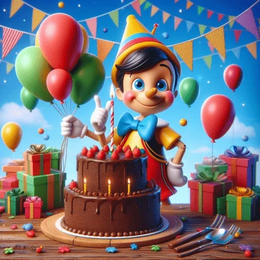 Pinóquio usando um chapéu de festa, com um bolo de chocolate decorado com velas e doces ao fundo, cercado de balões e presentes.