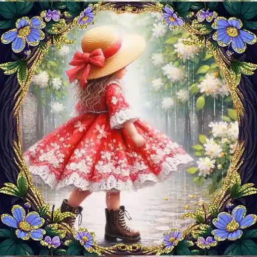 Menina vestida com um vestido vermelho florido e chapéu de palha com laço vermelho, em um cenário com flores.