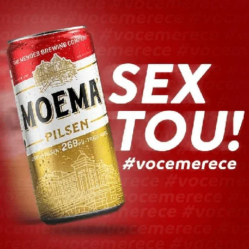 Uma lata de cerveja Moema Pilsen com o texto 'SEX TOU!' e '#vocemerece' ao lado, em fundo vermelho.