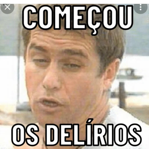 Um homem com expressão confusa e texto "COMEÇOU OS DELÍRIOS" sobreposto.
