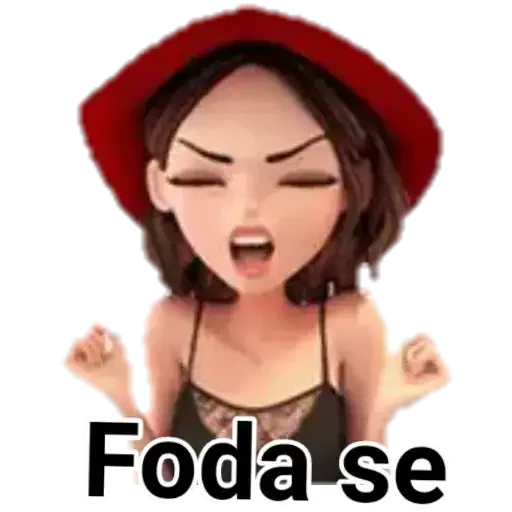 Uma mulher de expressão irritada, com um chapéu vermelho e uma blusa preta, com os olhos fechados e a boca aberta, dizendo 'Foda-se'.