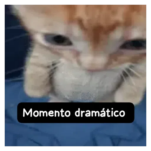 Gatinho com expressão séria e braços cruzados, com texto 'Momento dramático' em caixa de texto preta.