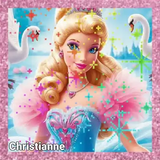 Uma princesa de cabelo loiro com vestido azul e rosa, cercada por cisnes e estrelas coloridas. O nome 'Christiannne' aparece no canto inferior esquerdo.