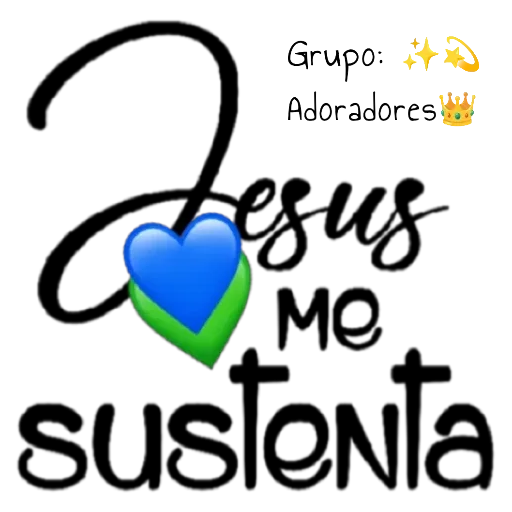 Uma figurinha com um coração azul e verde, com a frase 'Jesus me sustenta' em letras pretas. No canto superior direito, há o texto 'Grupo: Adoradores' acompanhado de emojis de estrela, oração e coroa.