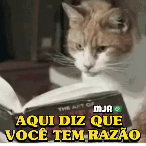 Gato lendo um livro com texto 'AQUI DIZ QUE VOCÊ TEM RAZÃO' em amarelo na parte inferior.
