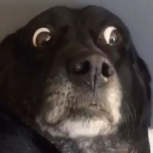 Rosto de um cachorro preto com olhos arregalados e expressão surpresa.