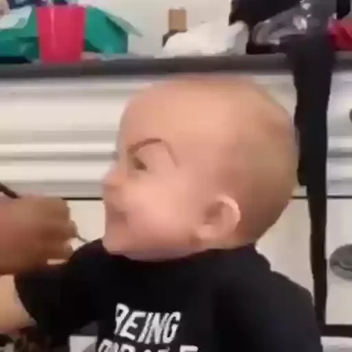 Um bebê com uma camiseta preta e texto branco sendo alimentado com uma colher, com uma expressão de surpresa ou susto no rosto.